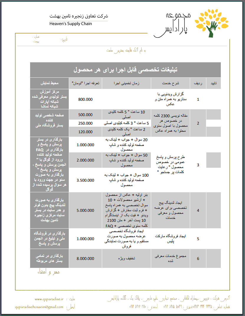 مجموعه پارادایس زیر نظر شرکت تعاونی زنجیره تامین بهشت در نظر دارد با بررسی روند تولید محصول ایرانی شرکت/کارگاه/تولیدی شما را معرفی و در بستر سایت WWW.QZPARADISE.IR بارگذاری و به نمایش عموم جوامه بگذارد روند کار بدین صورت است که :